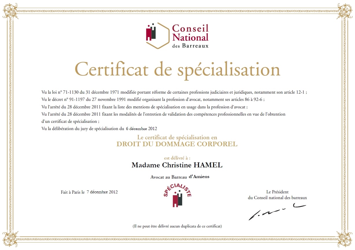 Je suis Titulaire du diplôme de spécialisation de dommages corporels.